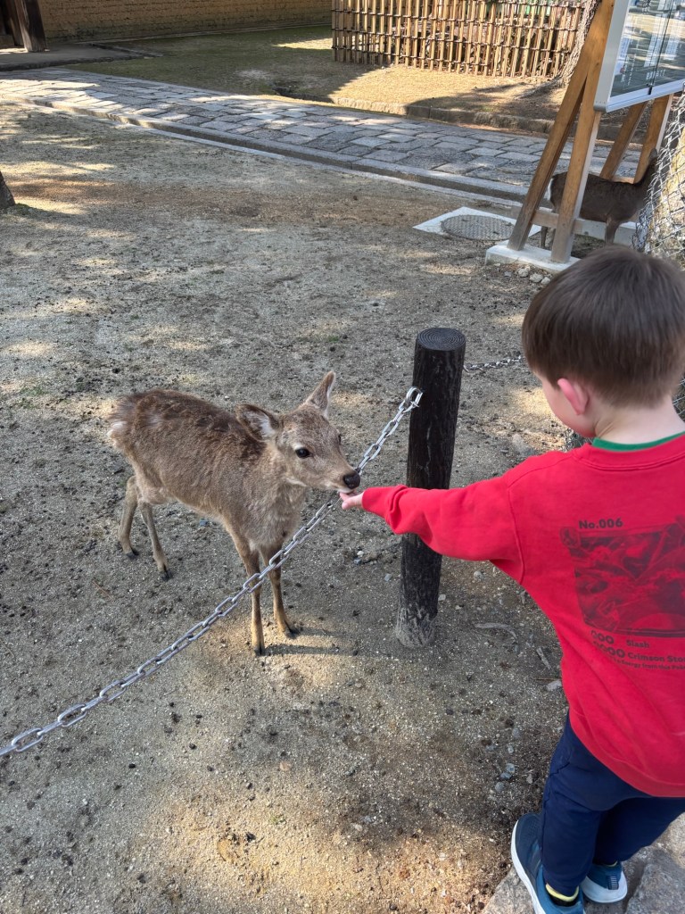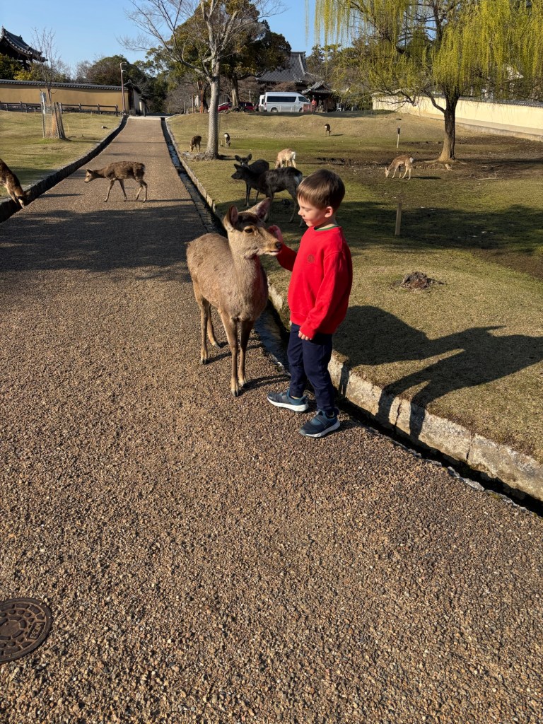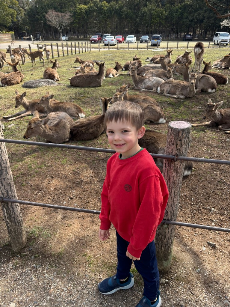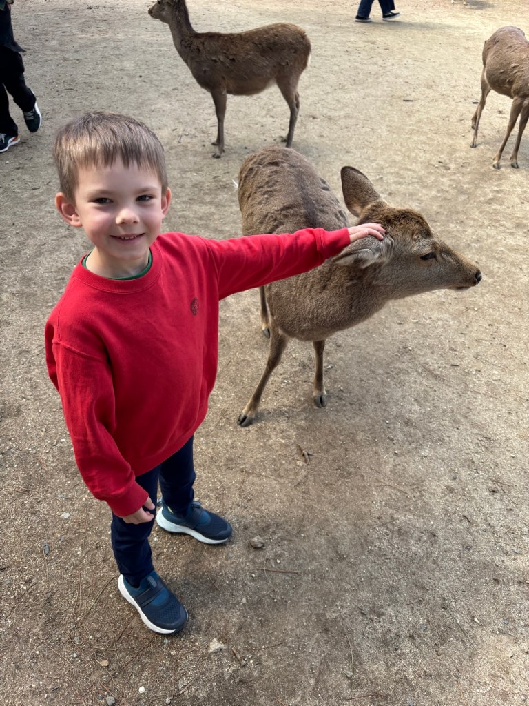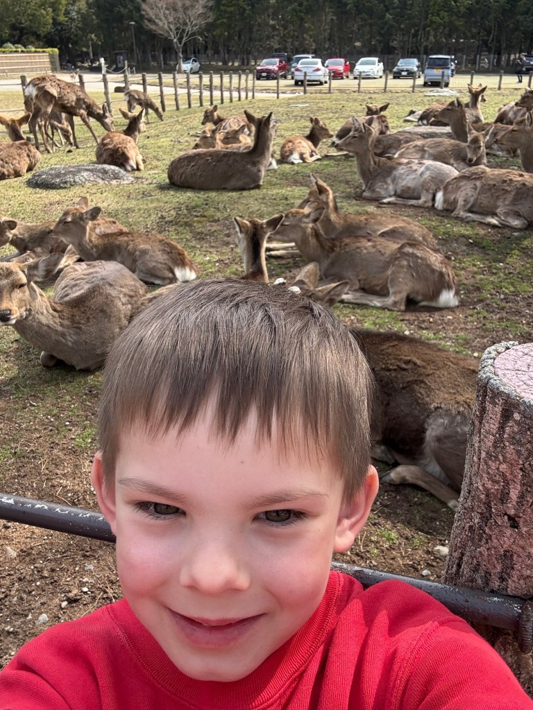 Day 3 we went to Nara. Blake has been waiting for this day since we moved to Japan in September. He was in heaven! He loves animals and to be able to walk around and pet the deer was so special for him. Riley and Grant were not impressed. Unfortunately I didn’t realize this was the Vernal Equinox in Japan and many people were off work. Also apparently they only sell a limited amount of the deer biscuits each day and had run out by the time we got there. So we didn’t get to feed them or really see them bow. But they were much calmer then we expected because they knew we didn’t have food. Blake was able to walk up to them and pet them. It was so fun to watch them randomly cross the road and stop traffic. And at lunch we watched them stealing food from people. It is such a fun atmosphere. We also went into the Todai-ji Temple and saw the giant Buddha. It was a small fee to enter, but a really cool thing to see. Blake took most of the deer pictures all by himself!