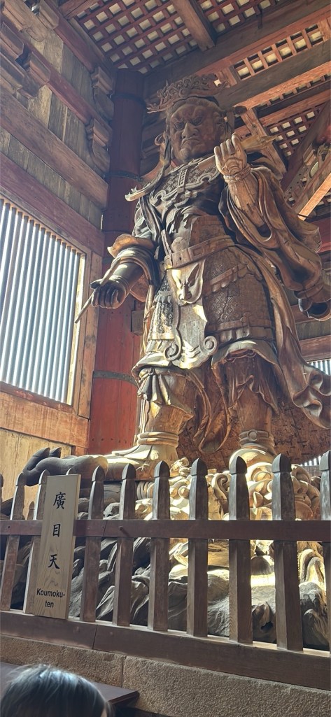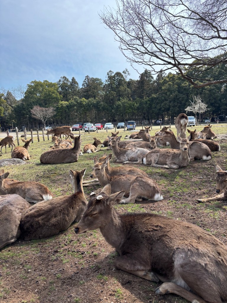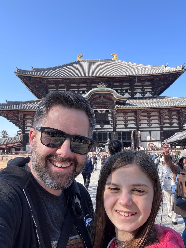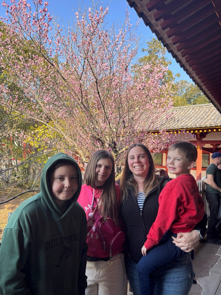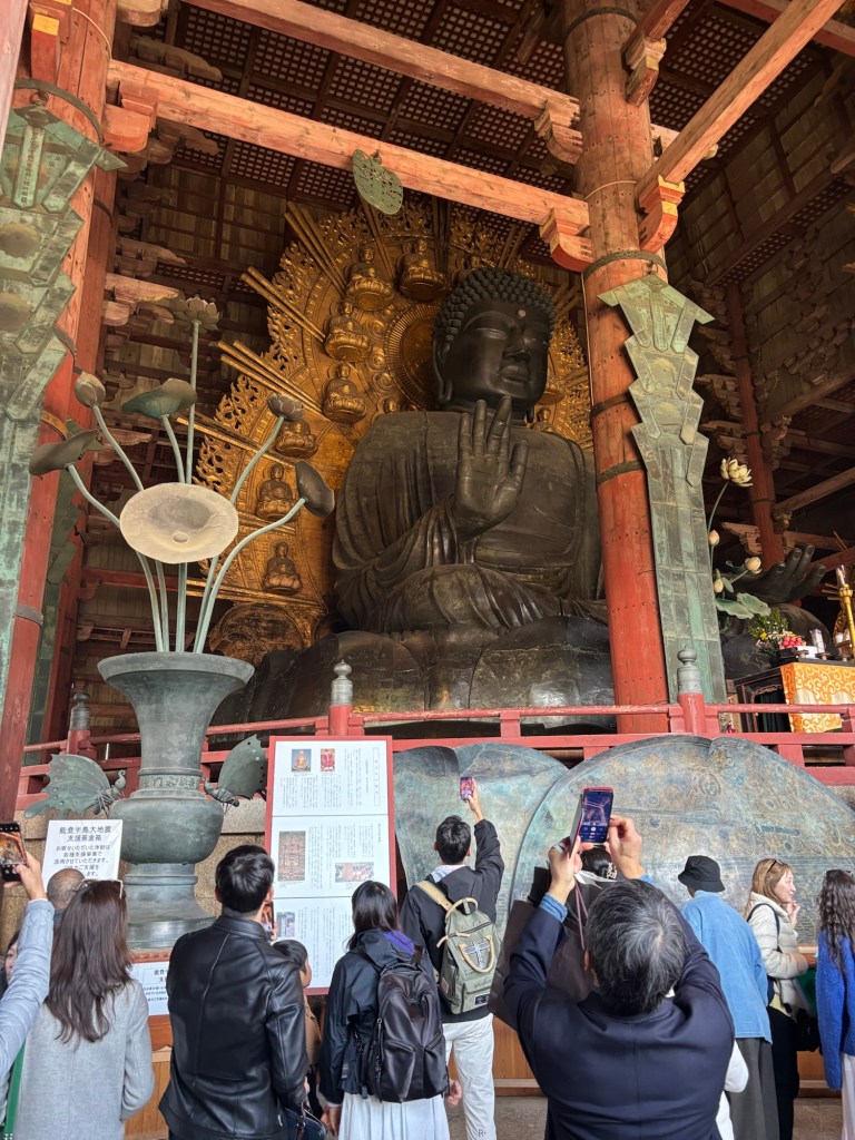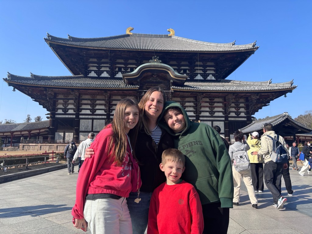 Day 3 we went to Nara. Blake has been waiting for this day since we moved to Japan in September. He was in heaven! He loves animals and to be able to walk around and pet the deer was so special for him. Riley and Grant were not impressed. Unfortunately I didn’t realize this was the Vernal Equinox in Japan and many people were off work. Also apparently they only sell a limited amount of the deer biscuits each day and had run out by the time we got there. So we didn’t get to feed them or really see them bow. But they were much calmer then we expected because they knew we didn’t have food. Blake was able to walk up to them and pet them. It was so fun to watch them randomly cross the road and stop traffic. And at lunch we watched them stealing food from people. It is such a fun atmosphere. We also went into the Todai-ji Temple and saw the giant Buddha. It was a small fee to enter, but a really cool thing to see. Blake took most of the deer pictures all by himself!
